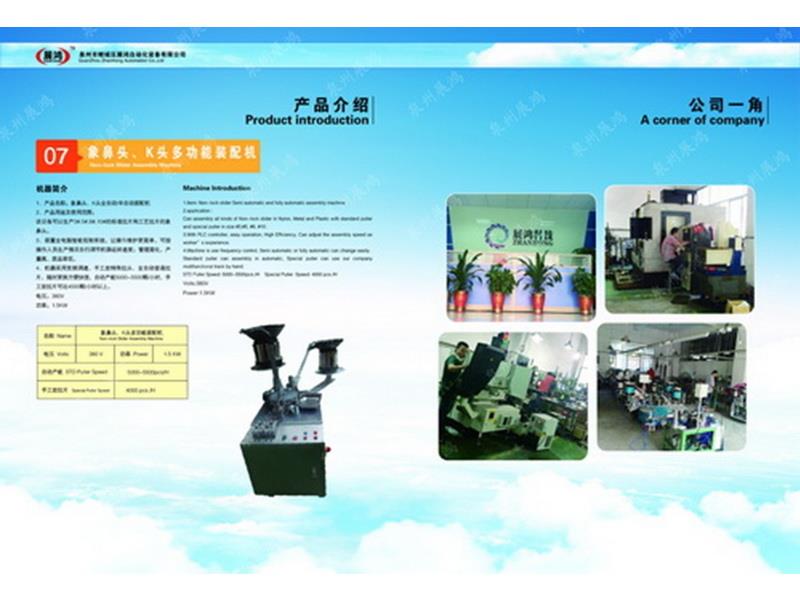 ??泉州市展鴻自動(dòng)化科技有限公司始創(chuàng)于2003年,是一個(gè)集研發(fā)、制造、銷售為一體的現(xiàn)代化公司,專業(yè)從事研發(fā)、生產(chǎn)各類型號的全自動(dòng)拉鏈頭裝配機(jī)。泉州市展鴻自動(dòng)化科技有限公司始創(chuàng)于2003年,是一家集研發(fā)、生產(chǎn)、銷售、服務(wù)于一體的現(xiàn)代化拉鏈頭設(shè)備智能制造生產(chǎn)企業(yè):專業(yè)從事研發(fā)、生產(chǎn)各類型號的全自動(dòng)拉鏈頭智能裝配機(jī)。亦可根據(jù)不同客戶的需求,提供適合客戶自身需要的“私人定制”式專用拉鏈頭設(shè)備及自動(dòng)檢測拉頭品質(zhì)一體機(jī)。泉州市展鴻自動(dòng)化科技有限公司始創(chuàng)于2003年,是一家集研發(fā)、生產(chǎn)、銷售、服務(wù)于一體的現(xiàn)代化拉鏈頭設(shè)備智能制造生產(chǎn)企業(yè):專業(yè)從事研發(fā)、生產(chǎn)各類型號的全自動(dòng)拉鏈頭智能裝配機(jī)。亦可根據(jù)不同客戶的需求,提供適合客戶自身需要的“私人定制”式專用拉鏈頭設(shè)備及自動(dòng)檢測拉頭品質(zhì)一體機(jī)。